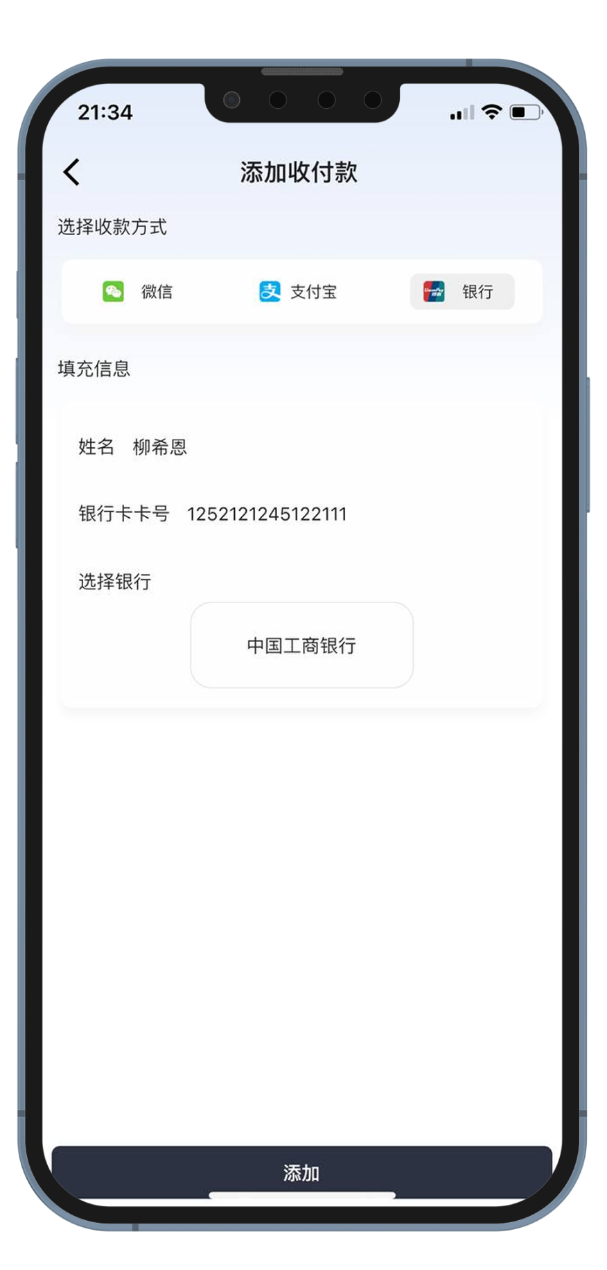 点击管理 再点击+号按钮 添加您的收付款信息