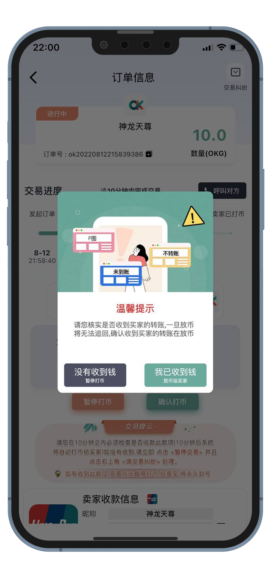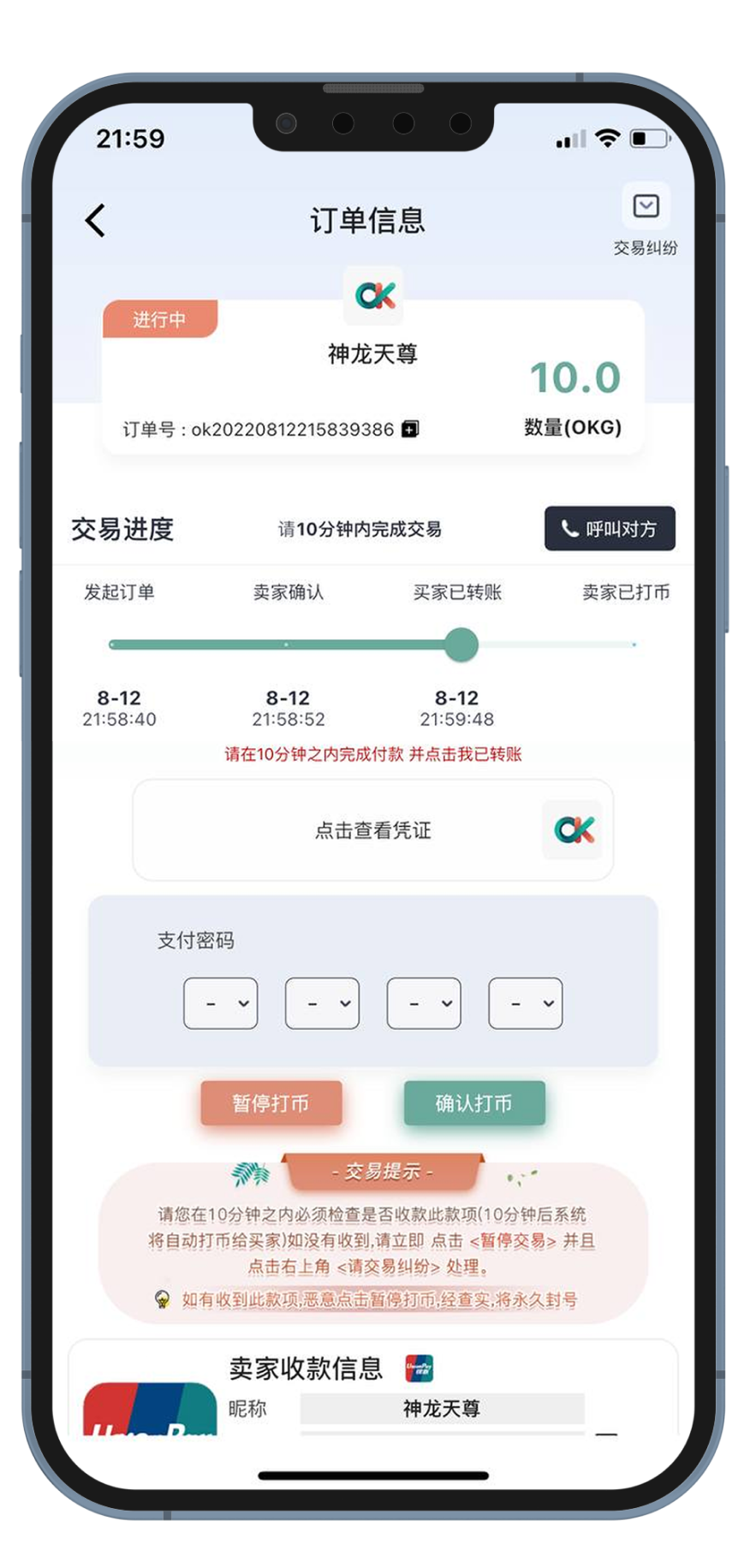 确认收到买家转账以后 输入支付密码点击确认打币按钮 如果没收到买家转账 请立即点击暂停打币按钮